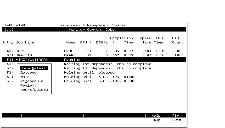 The Job Management Menu is used to manage jobs which are executing or pending. A pending job must be known to JAMS before it will display in the Monitor window. Please refer to the the JAMS Reference Manual section in Chapter 5 for information on when and how a job becomes known to JAMS.